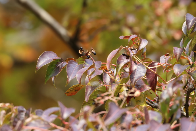葉が濃い紫色に色付いています。アントシアニンの紅色が葉緑素の緑色に混じり、光沢もあって独特な色合いをしています。上には褐色の果実と黒い種子が見えています。