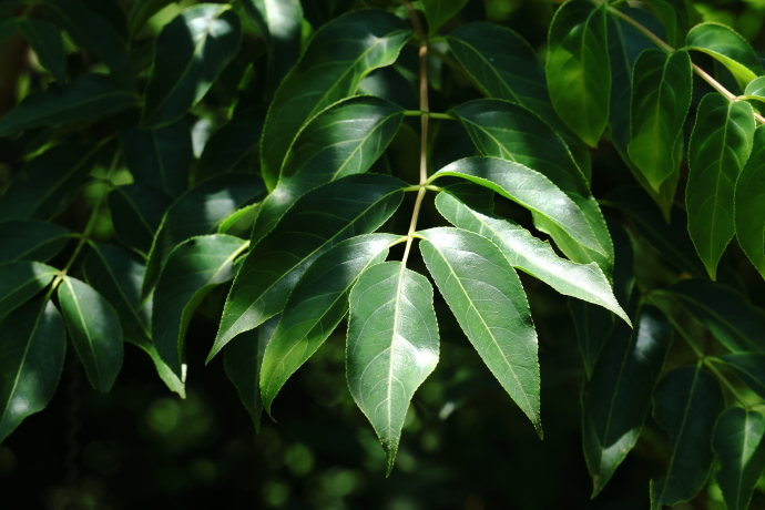 小葉の先は尖り、基部は丸みを帯びています。縁には細かい鋸歯があり、表面には光沢があって常緑樹の葉のようです。頂小葉はやや小さく、欠けることもあります。