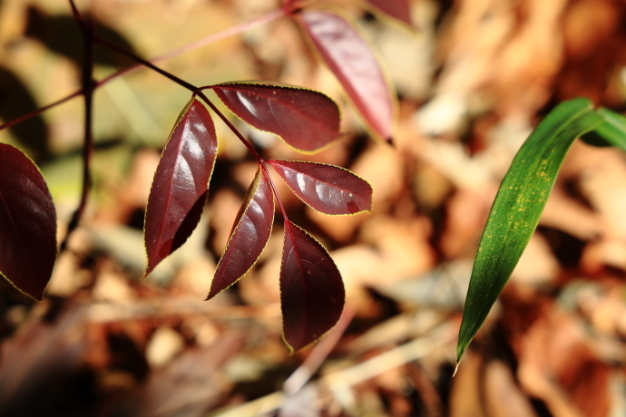 日のよく当たる南面の小道で、紅葉した幼木に出会いました。葉身は濃い紫色に染まっていますが、葉縁だけは黄緑色のままです。光沢を帯び、日に照らされて輝いています。