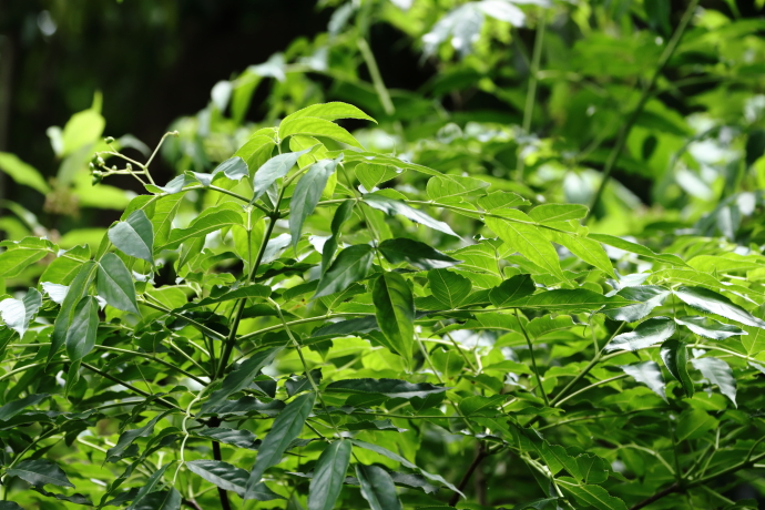 葉は対生する奇数羽状複葉です。葉軸には明瞭な稜があります。同じ奇数羽状複葉のニワトコも対生しますが、ニガキやヤマハゼは互生するため、識別に役立ちます。