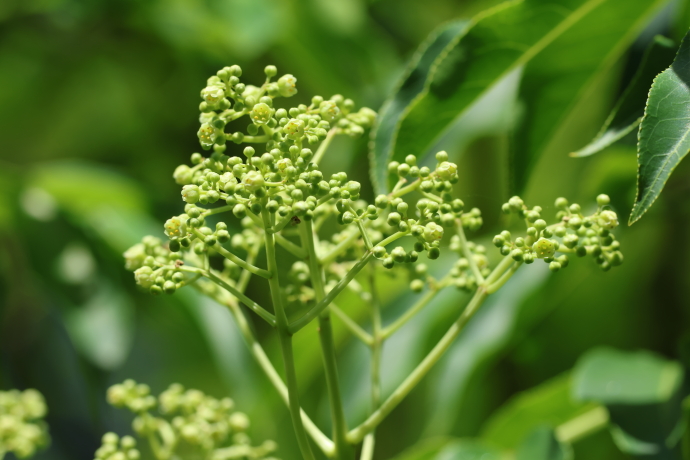 多数の蕾に紛れて、いくつかの花が咲いているようです。本年枝の茎頂に円錐花序をつくり、数多くの花を咲かせます。花弁は花序軸や蕾と同じ淡黄緑色で、目立ちません。