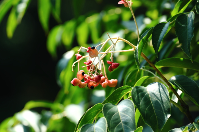 果実は袋果で赤く、熟すと裂開し、中から光沢のある黒い種子が姿を見せています。まだ8月ですが、今年は少し暑かったためか、この個体はやや早く熟したようです。