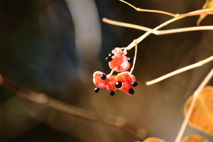 こちらではまだ赤い果実が残っています。紅葉が進むこの時期は、遠くからでもよく目立ちます。8月にも確認しており、果実が成熟する時期には幅があるようです。