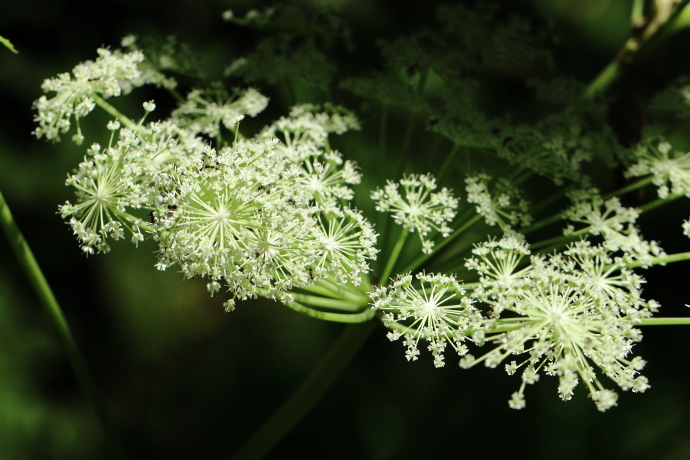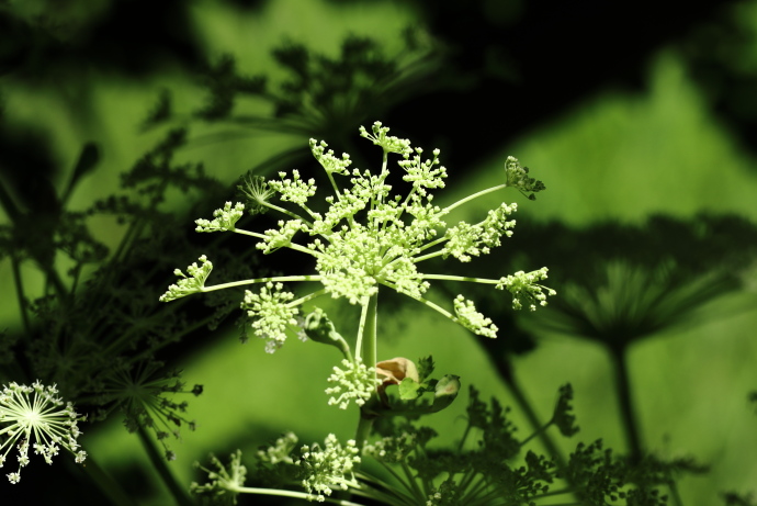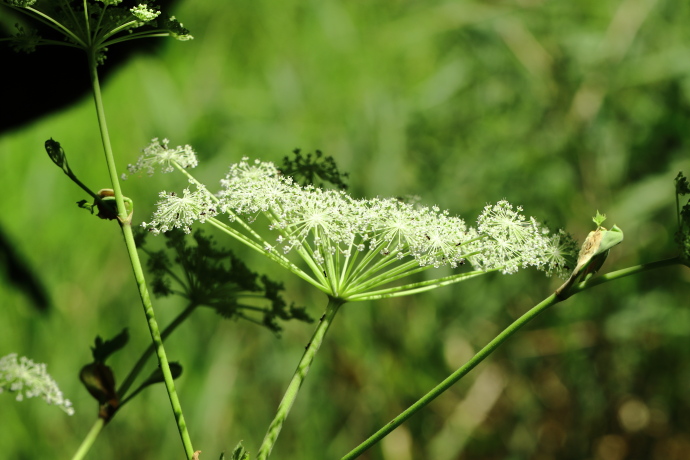 茎頂に複散形花序を形成し、先に白色の小さな花を付けます。まるで花火が広がったようです。同じセリ科のノダケに似ますが、花が白色で、暗紫色のノダケとは異なります。