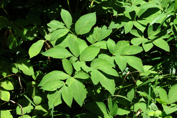 葉は互生する2~3回羽状複葉で、小葉は長楕円形、縁に鋸歯があります。頂小葉の基部は翼状に流れますが、他の葉柄では翼の発達は乏しいため、ノダケとの識別に役立ちます。
