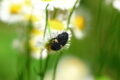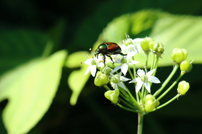 ニラの花の上で遊んでいます。チョウやハチ、アブのように吸蜜ではなく、花弁の摂食が目的と考えられます。バラ科・マメ科・ブドウ科を中心に幅広い食性を持ちます。