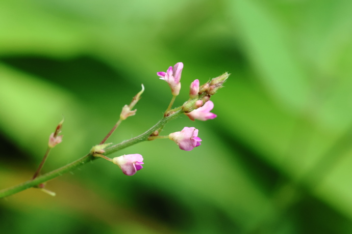 可愛い花が咲いています。花は蝶形で、花径は3mmほど。旗弁1枚、翼弁2枚、竜骨弁2枚からなり、旗弁は丸く直立し、翼弁は先が淡紅色を帯びています。森の中の小さな妖精です。