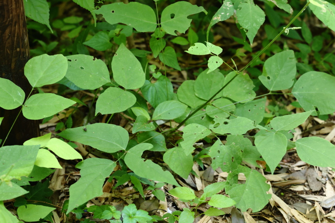 葉は互生で3出複葉。小葉は全縁で先が尖ります。葉は茎の下部に集まり、上部にはほとんどつきません。よく似たヌスビトハギは茎の上部まで葉がつくため、識別できます。