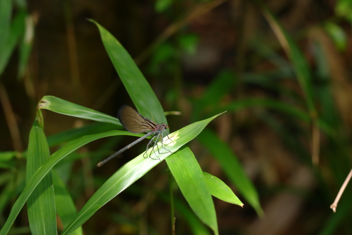 小川近くの薄暗い森で木漏れ日に当たり、黒い翅が浮かび上がっています。水辺に隣接する林や木陰を好み、身を隠しています。体全体が黒っぽく、こちらはメスです。