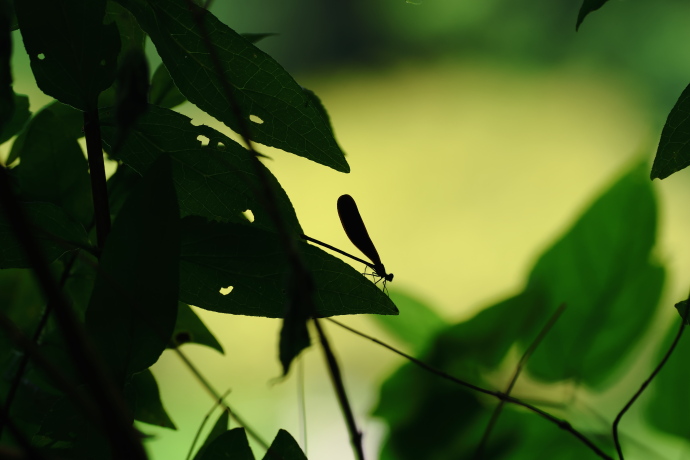 遠くにトンボの形をした黒い影が見えています。背景が明るく逆光で影しか見えませんが、翅が短いナイフのような形をしており、どうもハグロトンボのようです。
