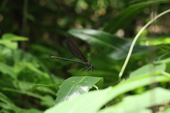 近づくと向かいの木に移りました。やはりハグロトンボでした。全体的に体色は黒色ですが、緑色の金属光沢があり、こちらはオスです。翅脈が浮かび上がっています。