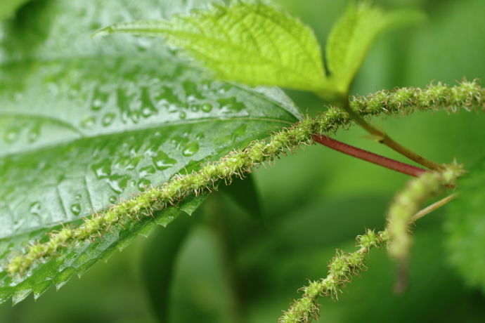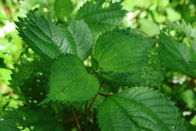 薄暗い森の林縁に群生します。カラムシと近縁で、かつて茎から繊維を採り糸にしていました。「マオ」はカラムシの別名で、藪に生えることから名付けられました。