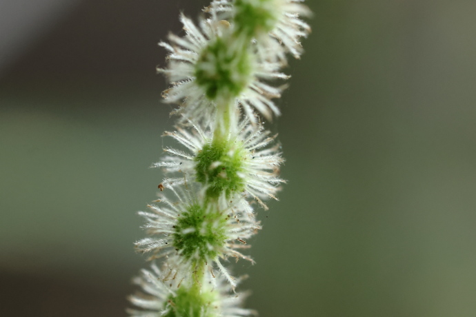 葉腋から穂状花序を伸ばします。まれに円錐花序になることもあります。雌雄同種で、茎の上部に雌花序、下部に雄花序を出します。こちらでは多数の雌花序が伸びています。