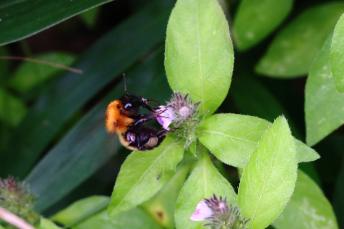 日本にいるマルハナバチの中では最も長い口吻を持ち、ツリフネソウやサクラソウなど蜜源の深い花を好んで訪れます。体中の長毛に花粉を付け、後脚に花粉団子を作ります。