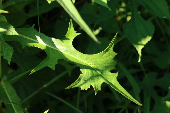こちらは下部の葉で、大型で、逆向きの羽状に深く切れ込んでいます。切れ込みのない葉をもつホソバアキノノゲシもありますが、通常こちらも本種に含められるようです。