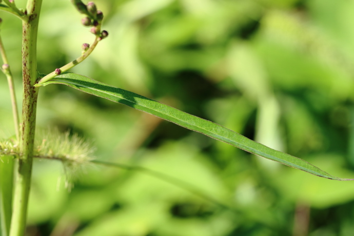茎葉は互生し、上部と下部で形が異なります。こちらは上部の葉で、小型で細長く、縁は全縁で切れ込みはありません。下部の葉は大きく、羽状に深く切れ込みます。