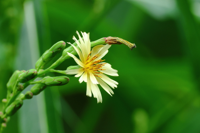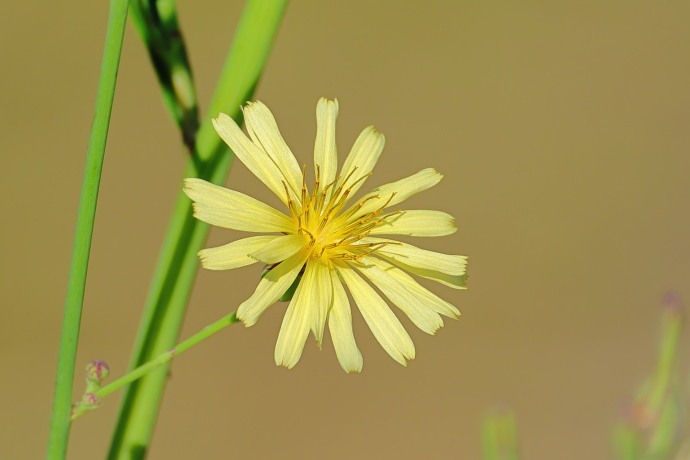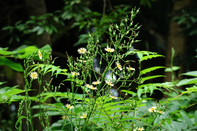 タンポポの仲間で、頭状花は淡黄色の舌状花のみから構成され、先端は5裂し、筒状花はありません。上部の葉腋から円錐状に枝分かれし、その先に頭状花をつけます。