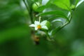 花が咲いています。葉柄と葉柄の間から散房状の花序を伸ばし、先端に4~10個の花をつけます。葉は互生し広卵形で、縁には細かい波状の鋸歯があり、葉柄には翼があります。