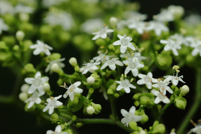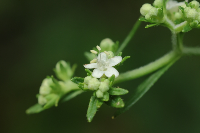 花序は集散花序で、主軸の花から咲き始めます。花冠は白く、先端が5裂し、雄しべ4本・雌しべ1本を備え、中央に柱頭が見えます。周囲には側枝に付いた蕾が並びます。