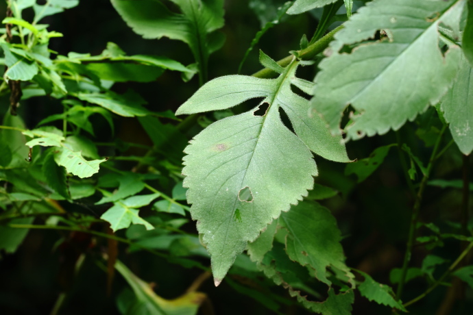背丈は高く、大きいものは1mほどになります。葉は位置によって形が異なり、茎の中部につく葉は中央裂片の大きい羽状に3~5裂します。こちらは3裂しています。
