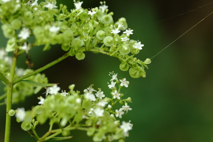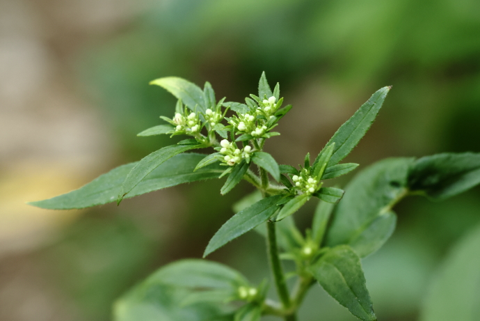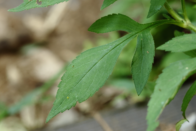 夏に入り、目立ってきました。斜上する茎頂や分岐した枝先に、集散花序を散房状に出し、鋸歯のある葉が対生しています。上部の葉は卵状楕円形~披針形で、分裂しません。
