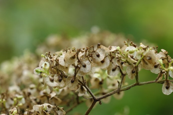 子房の下に寄り添う小苞が、随分と大きくなってきました。まるで仏像の光背のようです。上には果実が乗っています。秋になるとこのまま乾燥し、翼となって種子を運びます。