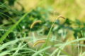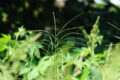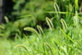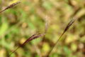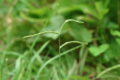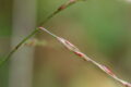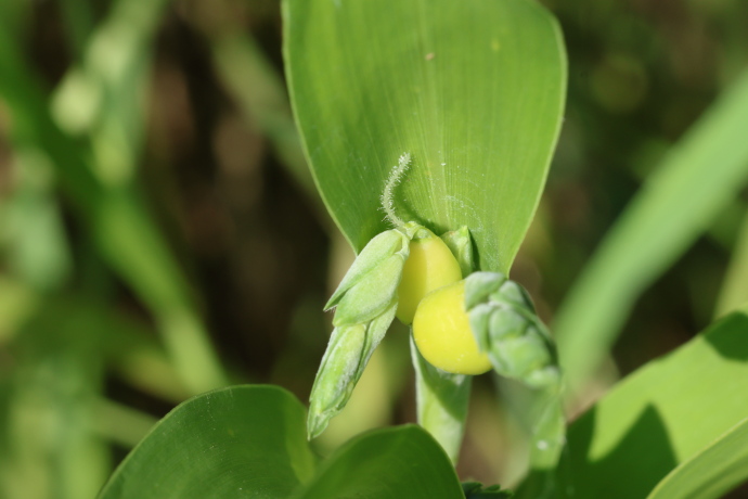 苞葉鞘が黄色く色づき、先端から雌しべと雄花の小穂が出ています。糸状のものは雌しべの柱頭で、雌花の小穂は苞葉鞘内部に隠れ、柱頭のみが外に現れています。