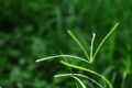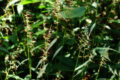 茎は直立し、幅広い線形の葉を互生します。葉の基部は鞘状で茎を抱きます。葉腋には丸い球状の構造が見られますが、これは果実ではなく、雌花を包む苞葉鞘です。