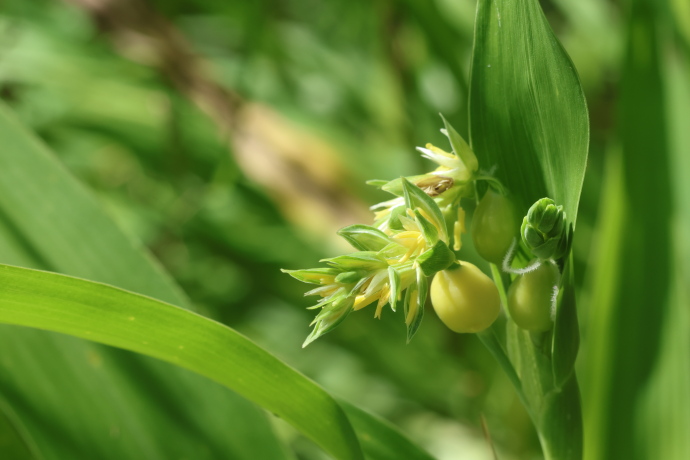 左の苞葉鞘では、黄色い葯を付けた雄しべが多数見られ、雌しべは見えません。右では雄小穂の下に雌しべがあり、葯は見えません。雌花が枯れた後に雄花の葯が現れます。