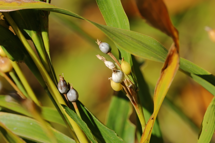 苞葉鞘が黒褐色に変わり、数珠玉が姿を現しました。黒っぽく光沢があり硬質で、ジュズダマの名に納得がいきます。果実は苞葉鞘を付けたまま熟し、苞葉鞘ごと脱落します。