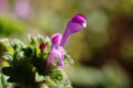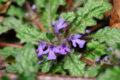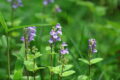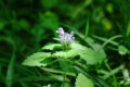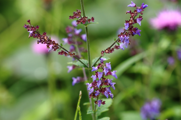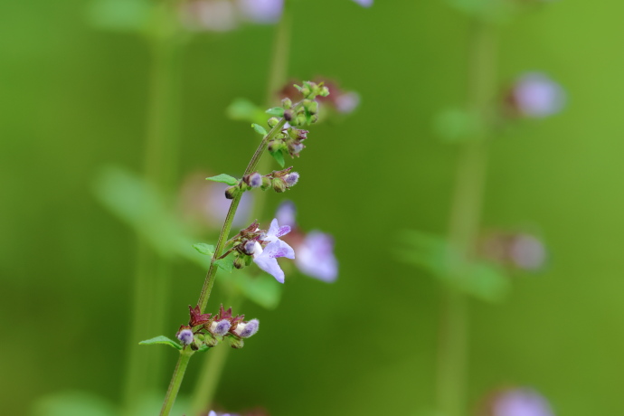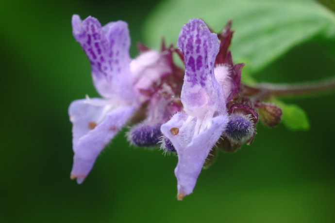 花は青紫の唇形で、上唇には青紫の筋が入り、先端は4裂して直立します。下唇は2裂して内側に巻き、雄しべ4本(2本は長い)、柱頭が2裂した雌しべ1本を包んで突き出します。