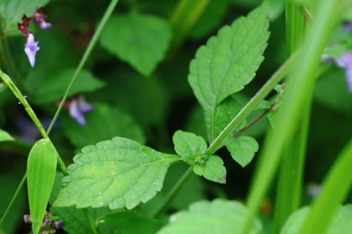 葉は対生し、広卵形で粗い鋸歯があり、基部は葉柄の翼と連続します。上部では葉柄が短く、無柄のようにも見えます。茎は四稜形で角ばり、下向きの伏毛に覆われています。