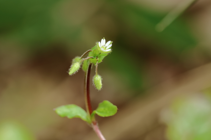 雄しべは1~7本、雌しべは1本で柱頭は3裂します。茎は赤紫色を呈し、日陰では緑色になることもあります。よく似たミドリハコベでは、雄しべが5~10本で、茎は常に緑色です。