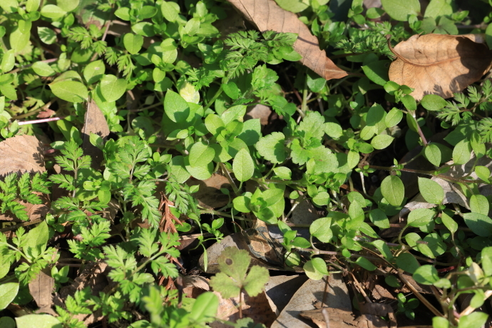 四方に匍匐性の茎を伸ばして広がり、ロゼット状に葉を広げるオヤブジラミと冬の陽を分け合っています。越年草の中でも冬季に比較的活発に生育し、匍匐しながら越冬します。