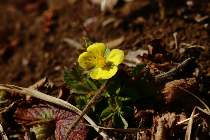 春には、ヘビイチゴ、ミツバツチグリ、ケキツネノボタンなど、花弁5枚の黄色い花が多く咲きます。本種は奇数羽状複葉を持ち、花茎先に集散状に花を咲かせるのが特徴です。