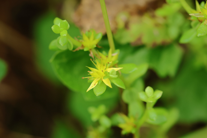 茎は地を這い、上部を立ち上げて草叢の隙間に集散花序を出します。葉は葉柄がなく、互生し、へら状の多肉質で厚みがあります。花は星型で黄色く、目を惹きます。