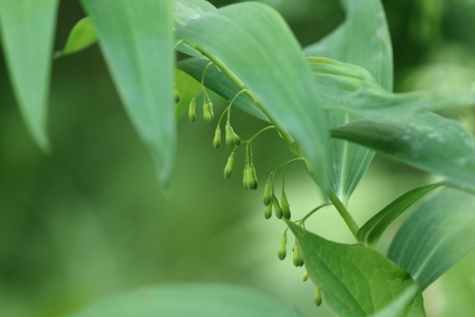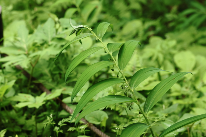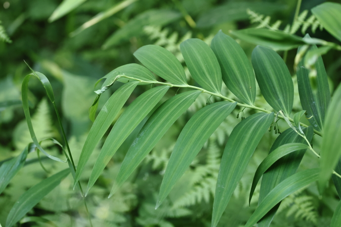 葉はササの葉をひと回り大きくしたような形で、アマドコロよりもやや細めです。表面には3本の葉脈が目立ち、裏面は全体的に白っぽく、葉脈の部分が盛り上がっています。