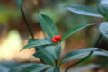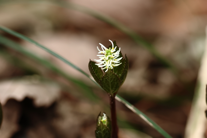 森蔭で群生しています。茎の上部に二対の葉が十字形に対生しています。節間が短く、輪生状に見えます。葉には光沢があり、無毛で、縁には鋭い鋸歯があります。