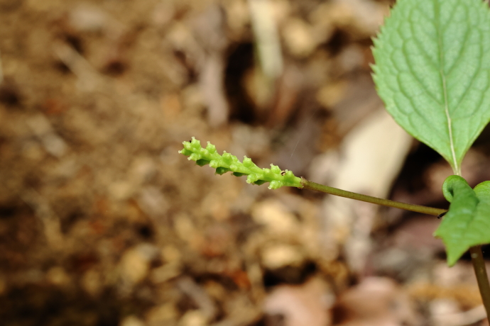 茎の先に緑色の穂状花序が伸びてきました。緑色の雌しべの周囲から、三本の雄しべが突き出ています。雄しべの花糸は白い棒状で、基部に黄色い葯が見えています。