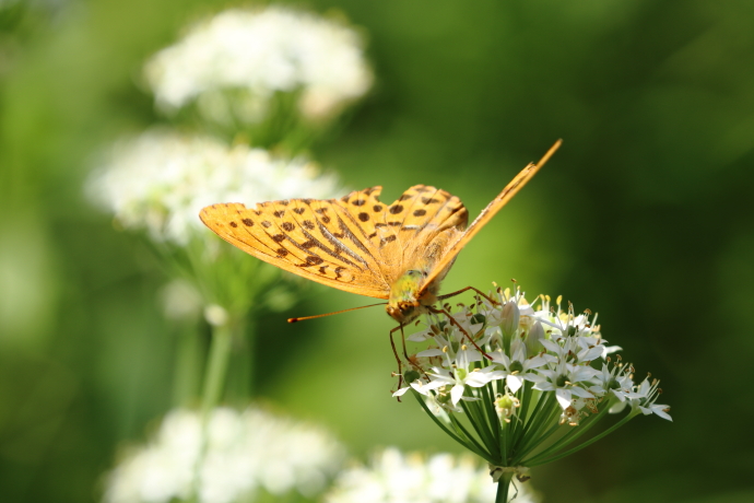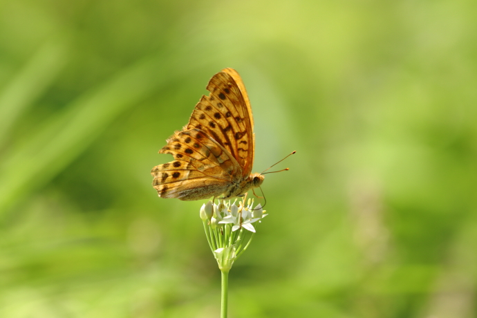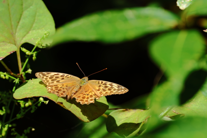 前翅表の肩近くにある3本の波線はほぼ並行で、後翅裏の白帯は3本です。前翅表の3本目の波線が斜めになり、後翅裏の白帯が1本で線状のメスグロヒョウモンとは異なります。