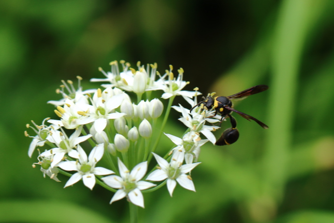 お好きなキーワードをどうぞ(例:ノイバラ、7月、ヒガンバナ科 等) ムモントックリバチ ハチの仲間 2022.09.232024.12.08 種類:_スズメバチ科, ドロバチ亜科 他のカテゴリー:ハチの仲間, 昆虫名マ行 幼虫の食性:シャクトリムシなど蛾や蝶の幼虫 成虫の食性:花蜜 9月11日(2022年) 新治市民の森単独性の狩バチです。泥で巣を作り、麻酔したシャクトリムシの幼虫などを巣に閉じ込め、産卵して幼虫の餌とします。巣がトックリ型になることが「トックリ」の由来です。 9月11日(2022年) 新治市民の森頭盾は黒く、メスです。腹部第1節は細長く、第2節は丸みを帯び、各後縁に黄帯があります。胸部前縁にも黄帯があります。胸部の黄斑は少なく、脚部に黄色部はありません。