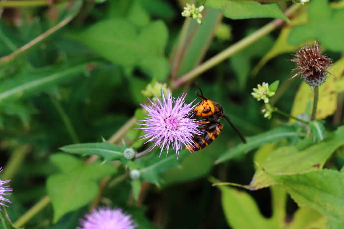 大きいものは体長が4cm程にもなり、世界最大級です。頭部は橙黄色で胸部は黒色、腹部は橙黄色と黒色の縞模様があります。強い毒性と高い攻撃性を持っています。