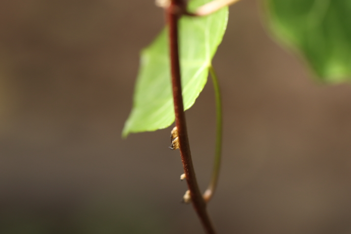 蔓には気根があります。こちらは垂れ下がっている蔓の気根ですが、この気根が付着根となり、他の樹木の微細な孔に入り込みます。粘液物質を出して固定し、よじ登ります。