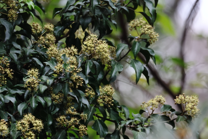 コナラを覆っています。落葉性のツタとは異なり、常緑で冬も葉をつけます。葉は互生し、卵円形~菱形状卵形で、掌状脈があり、縁は全縁です。若木の葉は3~5裂します。