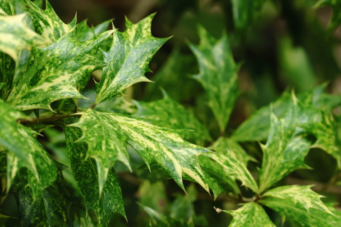 動物による食害を防ぐため、若木では鋭い棘状の鋸歯を葉につけます。樹高が高くなるにつれ葉は楕円形となり、成長した上部の葉には棘が見られなくなることもあります。