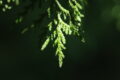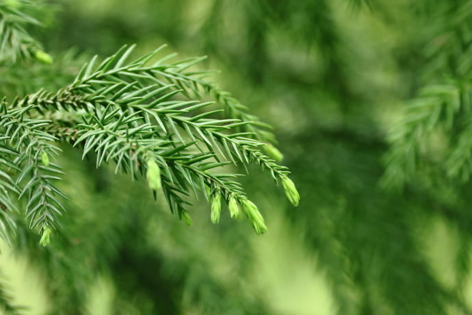 花粉の時期が終わり、新葉の展開が始まりました。葉は針状で細長く、枝に沿ってらせん状に密に付きます。ヒノキの葉は、十字対生で平たく広がるので、識別できます。