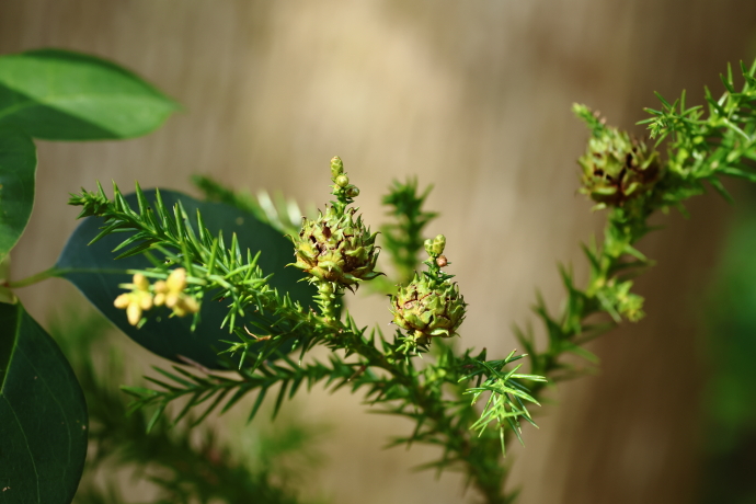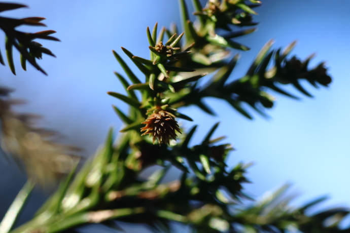 雌花がありました。この季節、雄花は橙色でよく目立ちますが、雌花は目立ちません。赤みを帯びた緑色で、鱗片を重ねて球形になり、枝先に下を向いて付いています。