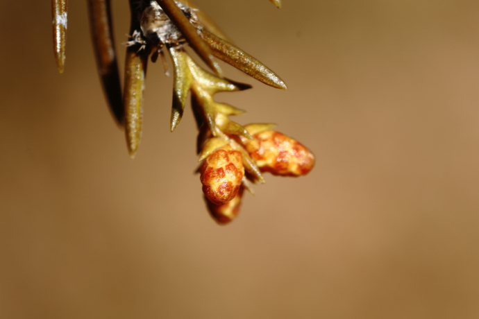 雌雄同株です。垂れ下がった枝先に多数の雄花をつけています。鱗片の間に花粉袋を持ち、多数の花粉をつくります。花粉を飛ばす時期に入り、橙色に熟しています。