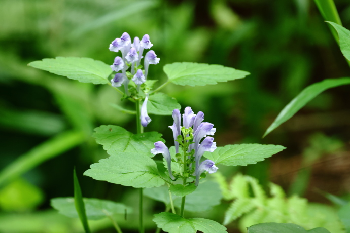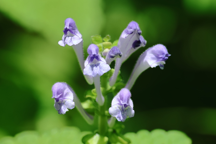花冠は淡紫色の唇形で、基部で上方に曲がります。上唇は兜状に膨らみ、下唇は3裂して横に突き出し、斑点があります。タツナミソウとは異なり、花序は伸びず高さが揃います。