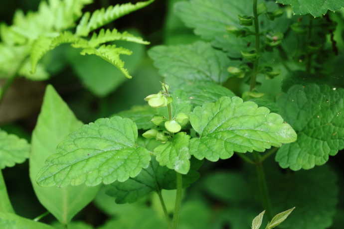 葉は対生し、基部は心形、先端や鋸歯は丸みを帯びています。茎の上部に葉が密に付き、花序直下の葉が最も大きくなります。茎には下向きの毛が密生しています。
